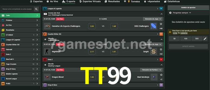 O TT99 oferece uma grande seleção de opções de apostas em e-sports com probabilidades competitivas